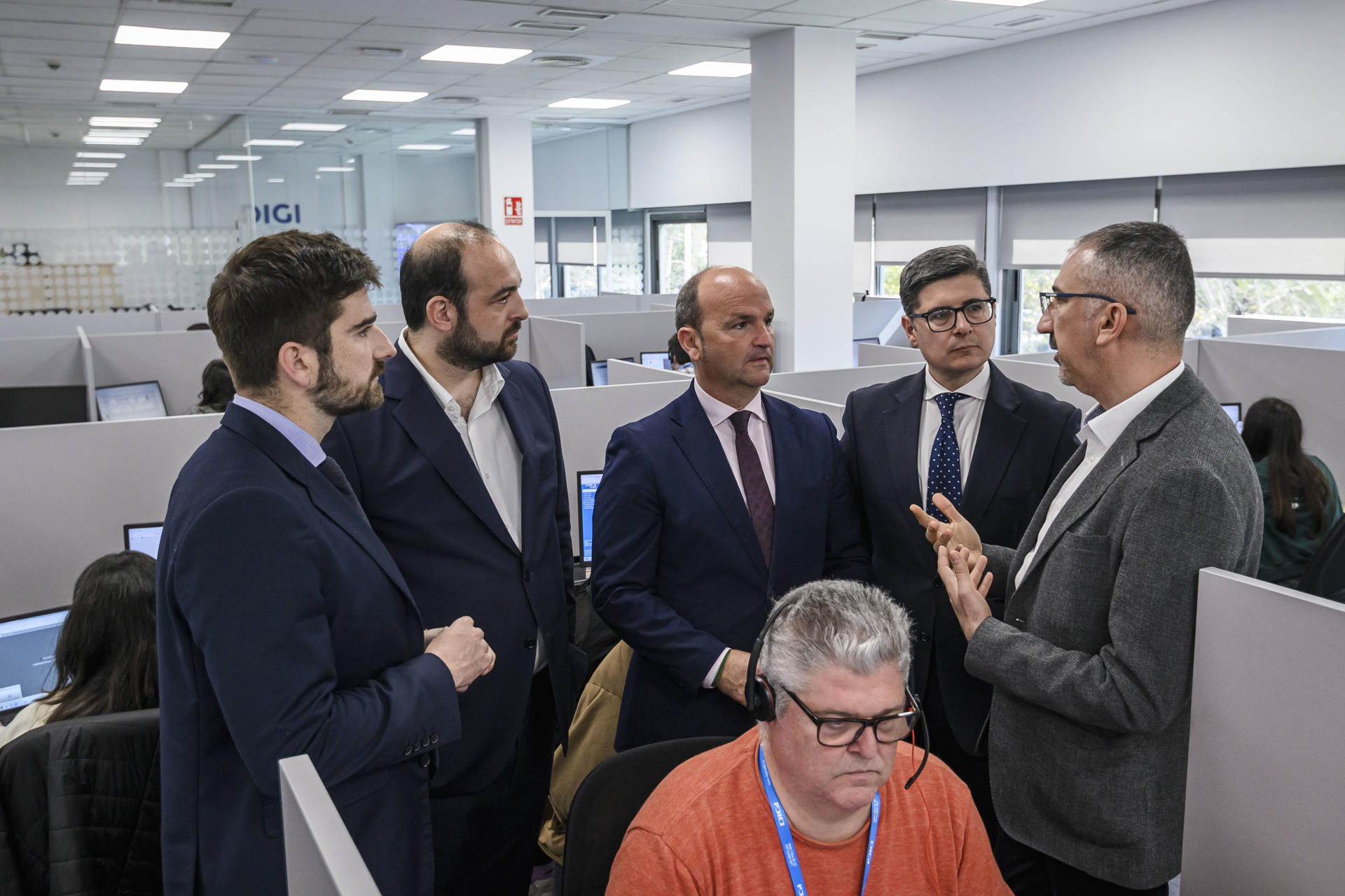 SEVILLA, 19/03/2025.- El CEO de DIGI España, Marius Varzaru (c), visita acompañado de otras personalidades, durante la inauguración del nuevo Centro de Atención al Cliente de DIGI en la ciudad de Sevilla, que ha tenido lugar en las nuevas instalaciones de la avenida de Kansas City. EFE/ Raúl Caro.