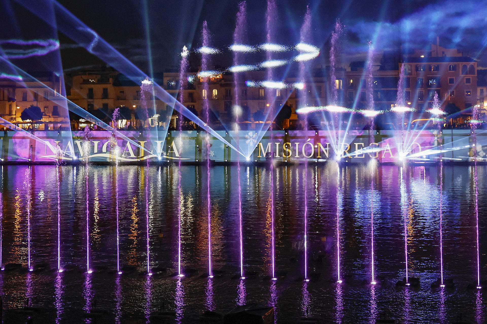 Para crear ‘Misión Regalo’ el Ayuntamiento ha dispuesto 11 proyectores de vídeo, 80 aparatos móviles para efectos aéreos, 22 láser, 25 fuentes de 20 metros de altura y 15 lanzallamas. EFE